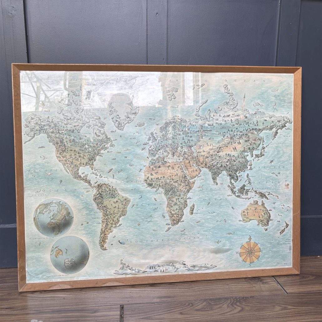 Pictorial world map by Biro. Published by James Galt and company limited, London and Cheadle, Cheshire. Printed in England. Comes already framed.