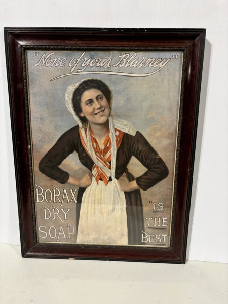 Reproduction of an old Borax shop advertisement presented in an old frame.
